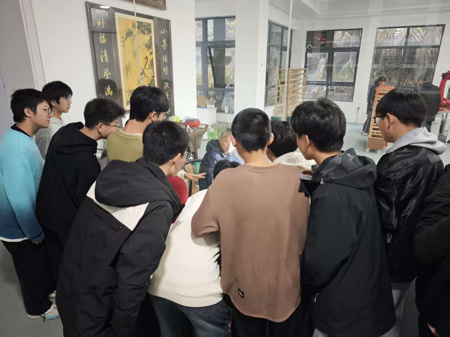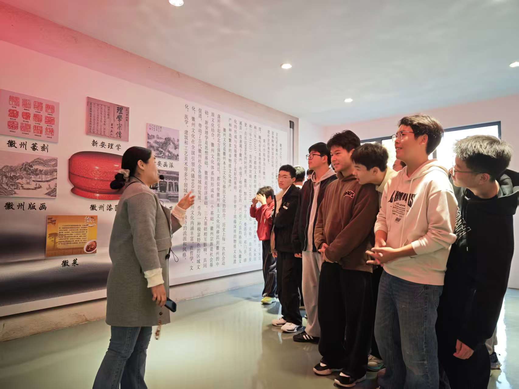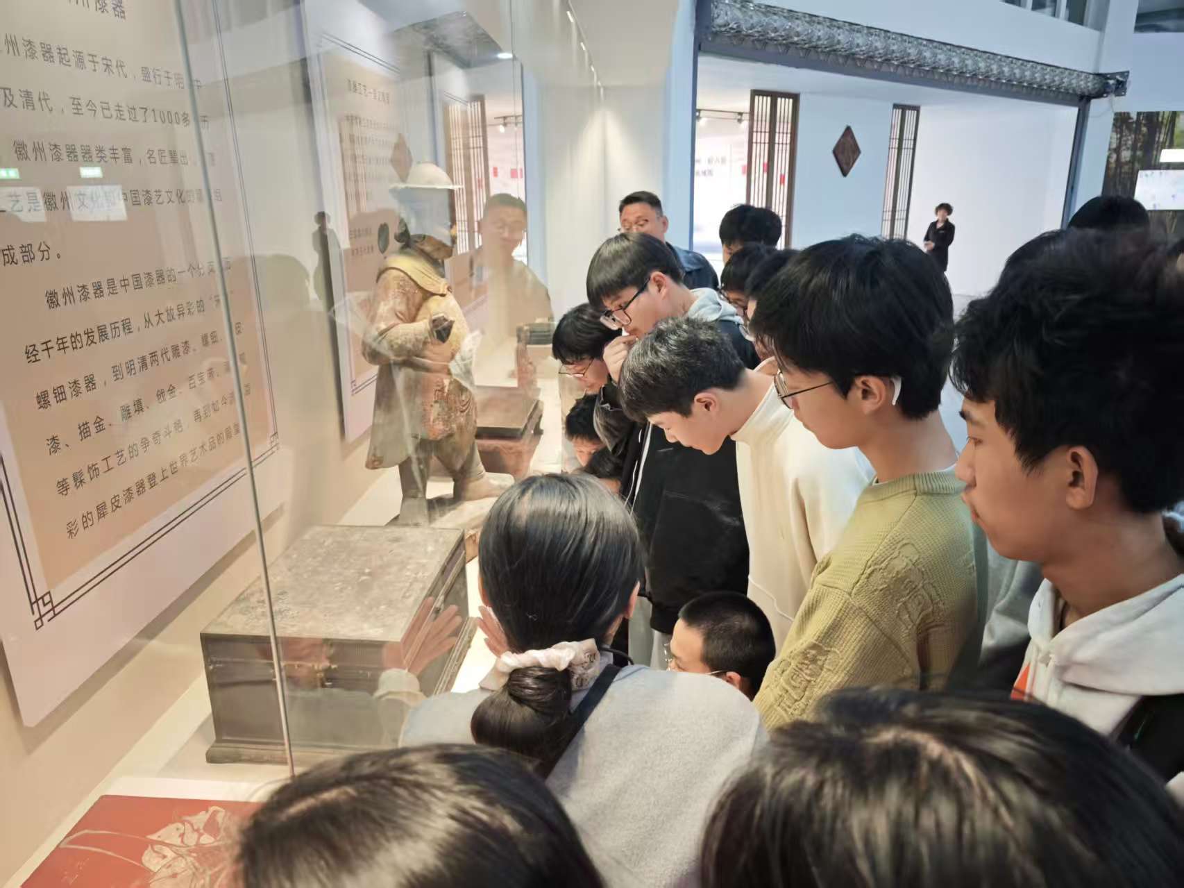 抵达徽州漆器艺术馆后,艺术馆专业导师结合实物展品,生动讲解徽州漆器的历史渊源、工艺流派及文化价值,导师同步穿插答疑引导,帮助学生理清知识脉络,深化对非遗文化的认知,落实“导-师-制+”中知识传授与文化浸润相结合的育人目标。