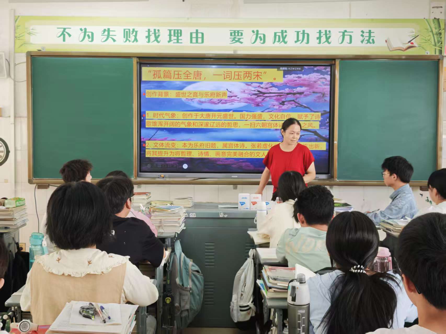 语文组王建莉老师以《春江花月夜》授课,以“月”为线索,通过音频范读、意象分析、小组讨论,引导学生品读诗文韵律,走进“春江潮水连海平,海上明月共潮生”的意境,解读“景、情、理”交融艺术,挖掘诗人哲思,让学生感受古典文学魅力。