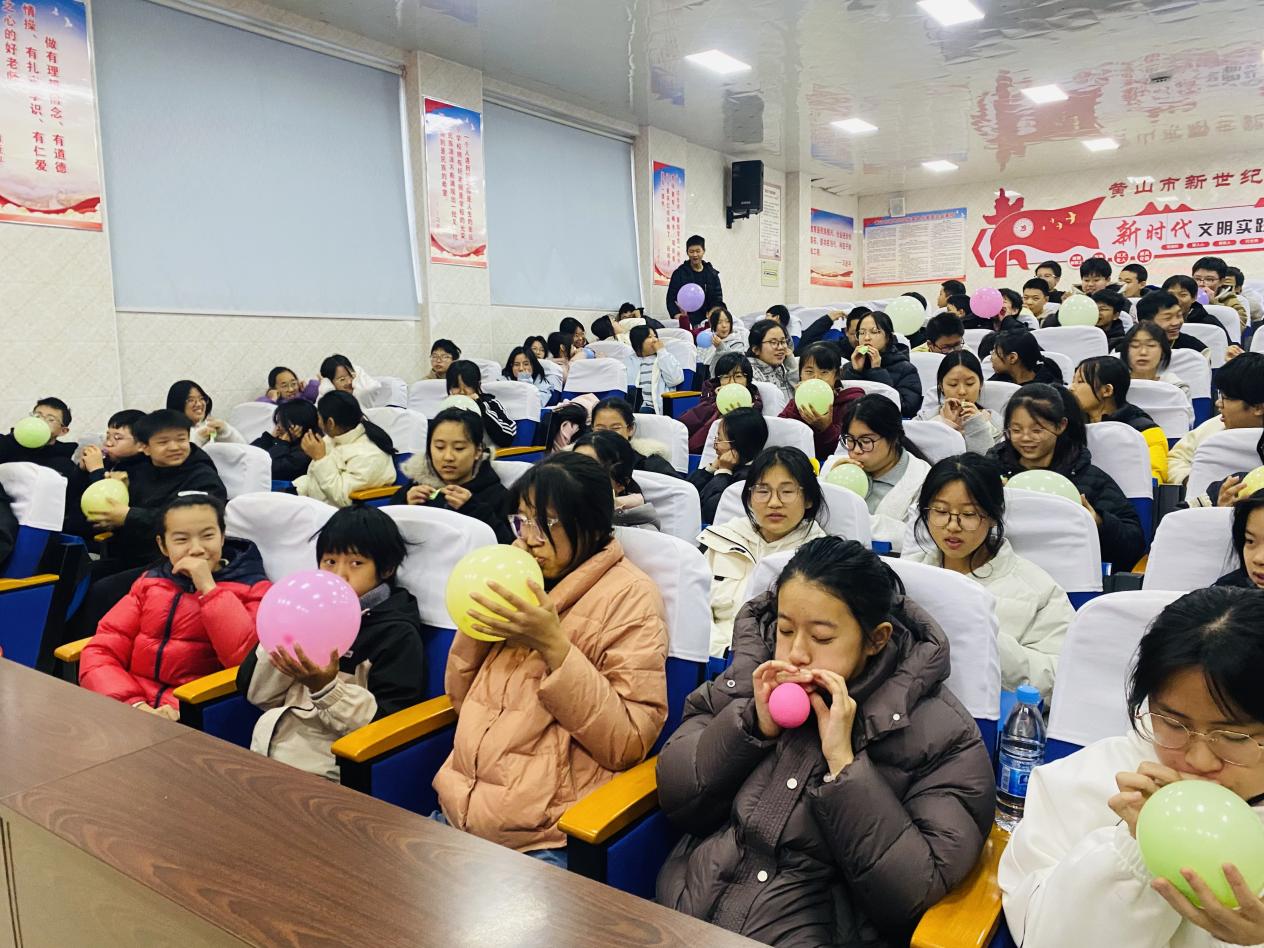 最受同学们欢迎的当属“吹气球释压”互动环节。拿到气球后,大家纷纷将心中的压力、烦恼化作吹气的动力,看着气球慢慢膨胀,脸上的笑容也逐渐绽放。老师借此引导同学们:“气球就像我们的情绪容器,适度释放才能保持平衡,就像人际关系中,学会合理表达感受、释放压力,才能收获和谐与快乐。”现场气氛热烈,同学们在轻松的体验中学会了情绪调节的简单方法。
