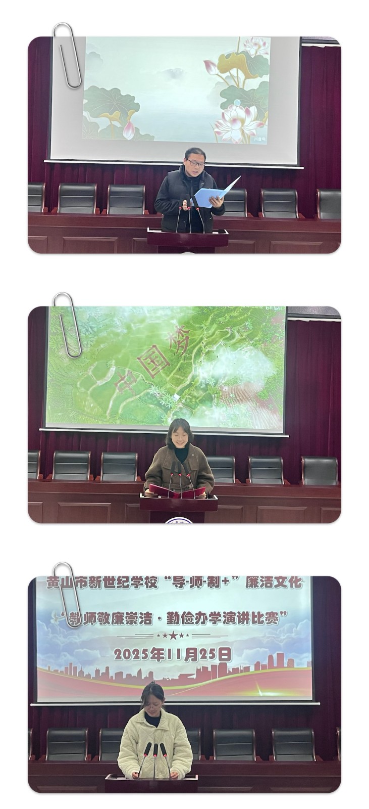 为进一步促进“廉洁文化进校园”活动的深入开展,推动“导-师-制+”廉洁文化育人实效,营造廉洁从教的育人环境,培育师生敬廉崇洁,勤俭办学的价值观,增强广大师生干净做人、规范做事、遵纪守法的自觉性,11月25日晚,黄山市新世纪学校举行“敬廉崇洁 勤俭办学”教师演讲比赛。