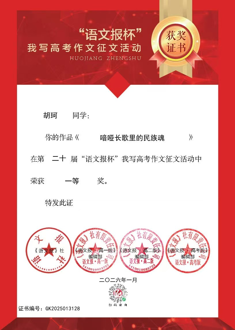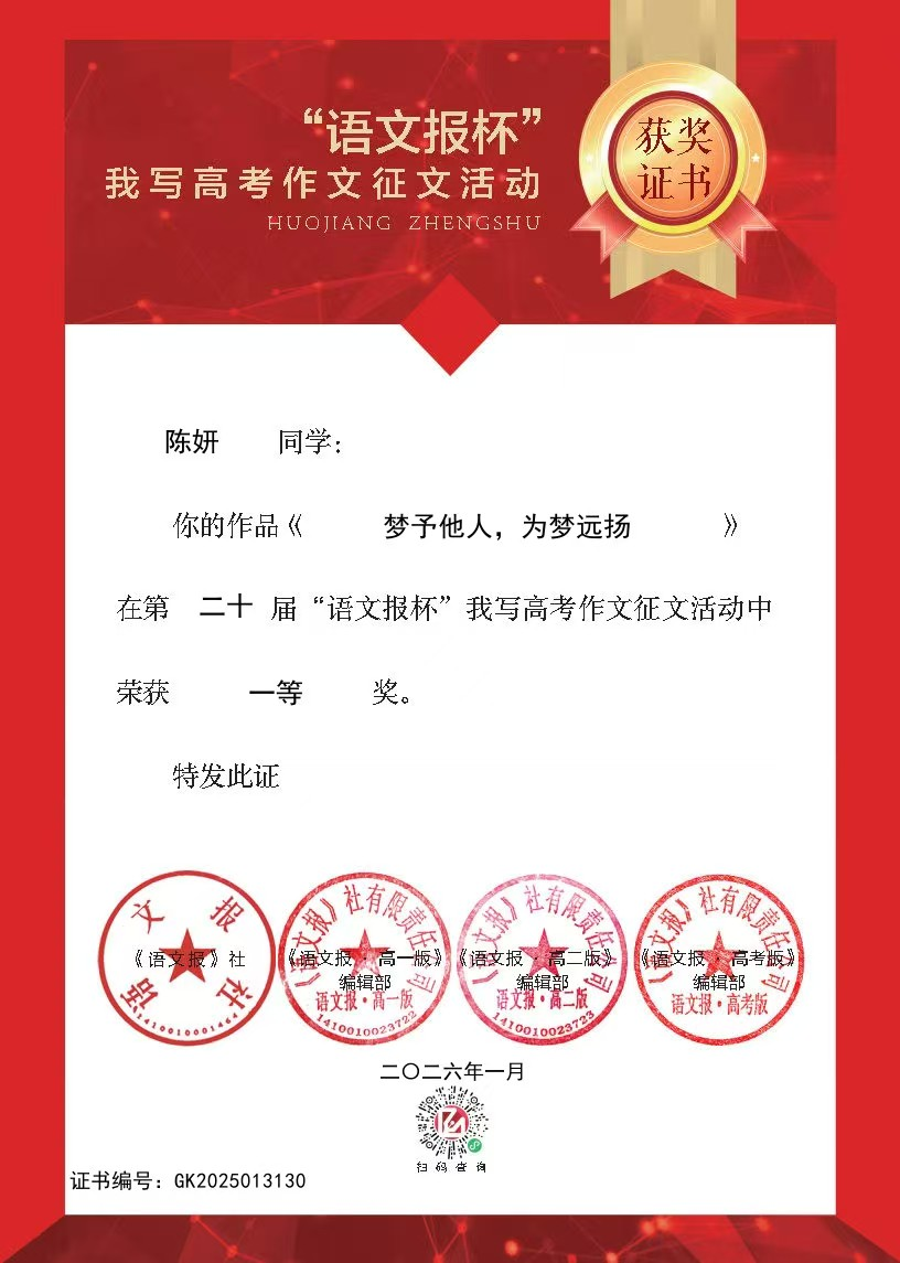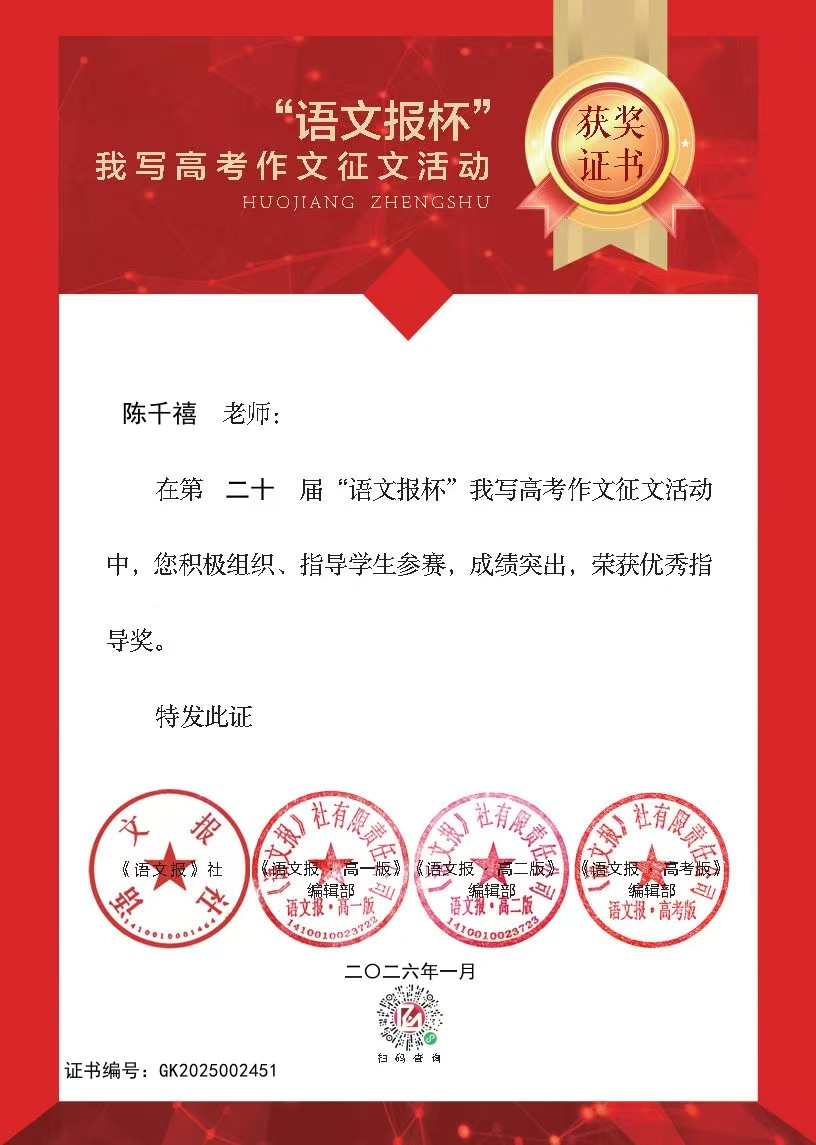 一直以来,高中部始终重视语文学科核心素养培育,依托“导师制+”精细化教学体系,打破传统写作教学模式,实现精准培优、因材施教。备赛期间,高中部语文组全体教师高度重视、精心筹备,围绕审题立意的把控、素材的灵活创新、语言文字的精细打磨、思想情感的深度升华等核心要点,开展精准辅导。同学们满怀热忱、积极备战,在老师的指导下反复打磨文稿,不断锤炼文笔、提升思辨能力,以笔为媒、以文抒怀,将日常积累与所思所感融入作品之中,用文字展现新时代青少年的精神风貌与文学素养。历经数月的潜心备战与激烈角逐,我校参赛学子凭借扎实的写作功底、清晰的逻辑思维、细腻的文字表达和深刻的思想内涵,在众多参赛作品中脱颖而出,斩获一等奖3名、二等奖7名、三等奖17名,获奖人数众多、覆盖面广。同时,为表彰我校教师专业的指导能力与敬业的育人精神,大赛组委会特授予我校高中部4名语文教师优秀指导教师奖。