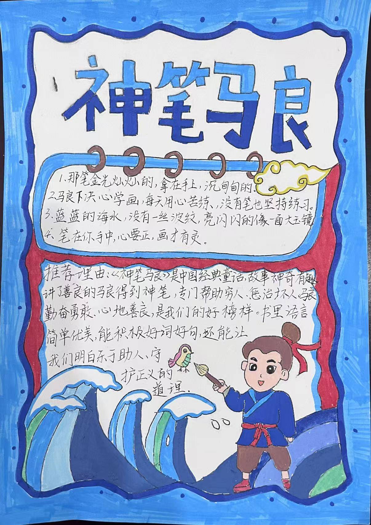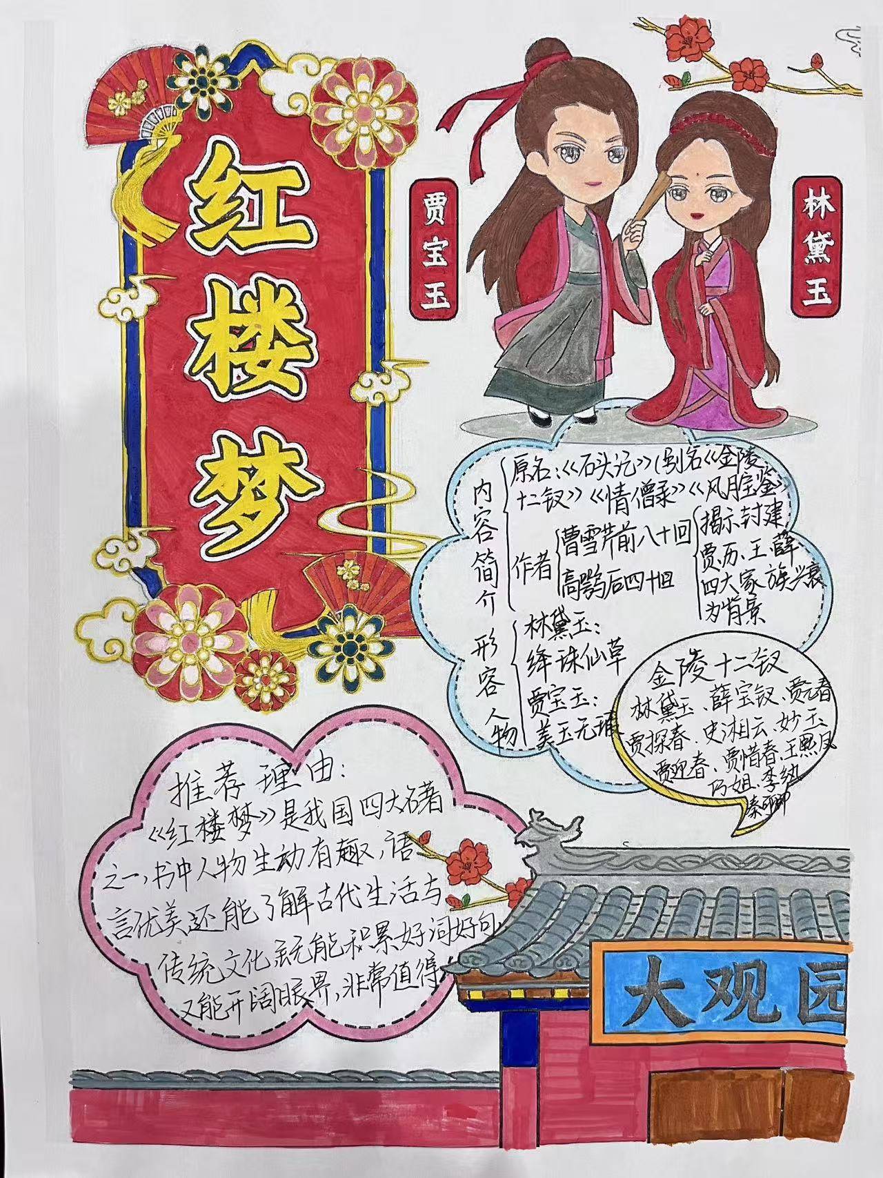 计推荐卡片,有的绘制孙悟空形象,有的再现温情场景,还有的梳理科学知识。卡片上写着书名、作者、推荐理由和精彩句子。同学们在推荐《红楼梦》和《神笔马良》时写道:“读《红楼梦》,我看到了一个封建大家族的兴衰荣辱,感受到了曹雪芹笔下细腻的情感和深刻的社会洞察;读《神笔马良》,马良用画笔惩恶扬善的故事让我懂得了善良和正义的力量。这两本书让我收获满满。”这些推荐卡成为同学们相互借阅书籍的“导航图”。 活动引导学生从“爱读书”向“会读书”转变,培养了信息筛选和审美表达能力。